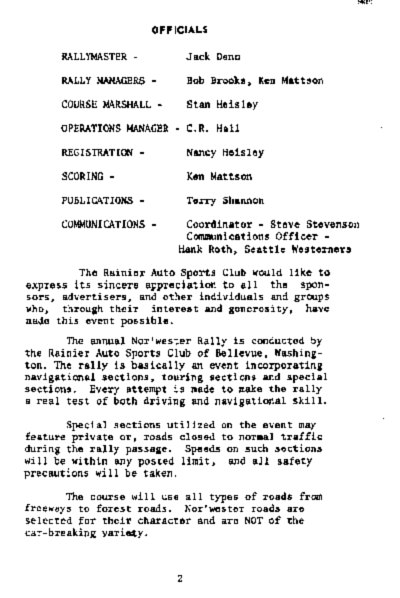 Summary: For the first time the rally concentrated on the eastern slopes of the Cascades. Friday overnight in Centralia and Saturday overnight in Ellensburg. This year, with increasing press coverage, Seattle television station KOMO (ABC) filmed parts of the rally for their "Exploration Northwest" program. Nor'wester was also voted "Best Rally of the Year" in the Northwest (the first year for such an award). Observed by the SCCA for national sanction. The prize fund was $900, and entries numbered 48.