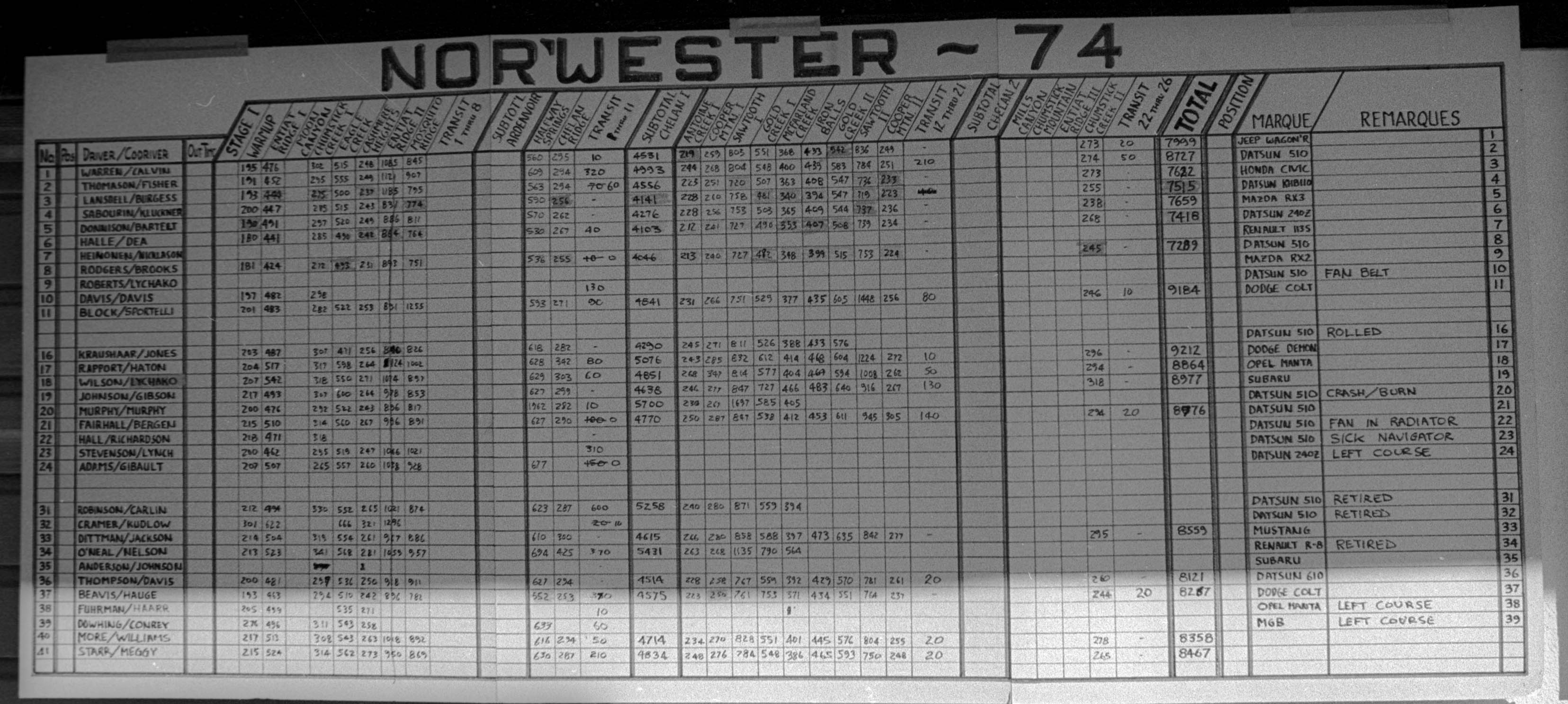 Summary: It was about 450 miles, maybe 300 miles of gravel, non-stop (roughly early afternoon to early morning) over some remarkable if somewhat rough roads in Eastern Washington. It started in Leavenworth, over the hill to Ardenvoir and on to Chelan, then to Antione Creek, Methow Valley, Cooper Mountain, back to Chelan, Entiat and Leavenworth, over about every through gravel road we could find. We had to scrub about 50 miles due to a fire closure. This was essentially a stage rally but I don't know how we got away with it or had the balls to put it on since there were no closed roads, road guards, communications, etc., etc.. The only saving grace was that the meat of the rally was at night. Car prep and safety was not anywhere near what it is today either. -- Steve Richards